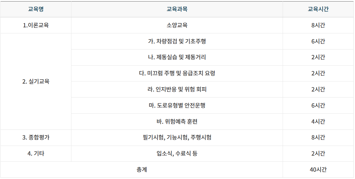 - 총40시간(5일 과정) : 이론교육 8시간, 실기교육 22시간, 종합평가 8시간, 기타 2시간