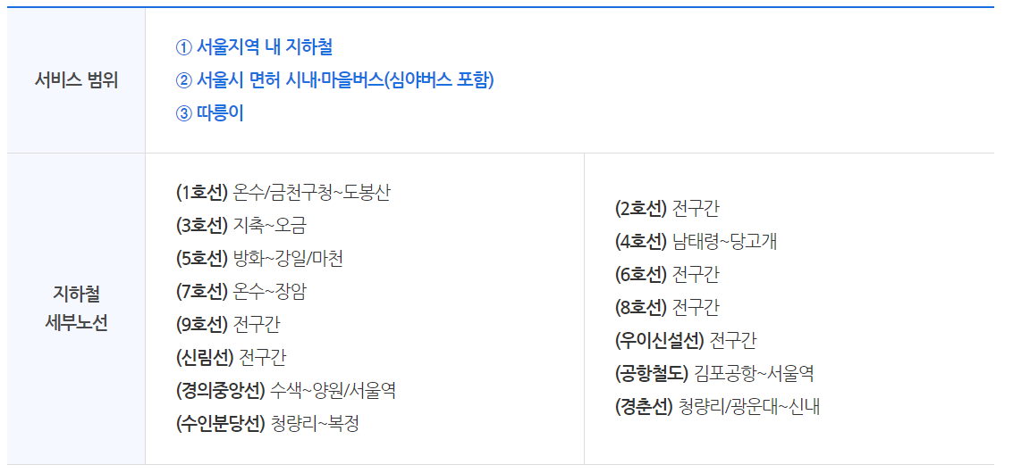 - 이용범위: 서울지역 지하철, 서울시 면허 시내·마을버스, 따릉이