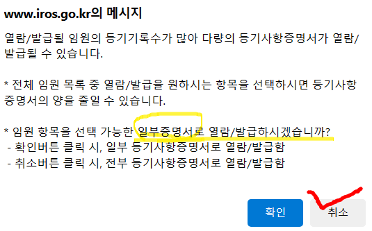 - 전부/말소포함을 누른다. 다음 누름. 여기서 <꿀팁> 등기사항이 많을때 전부/말소포함이 안 나오고 일부/말소포함이 자꾸 나올땐 확인 취소에서 취소를 누르면 전부/말소포함이 나온다.
